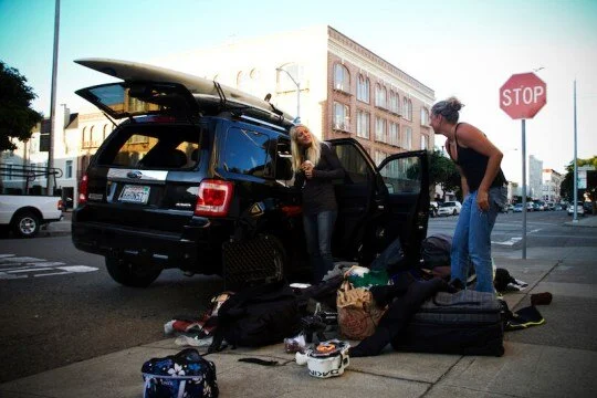 The next day we headed to San Francisco, our last stop. By this point the car was a girl explosion, so here you can see Morgan and I attempting to clean out Chris’s car in the middle of the city.